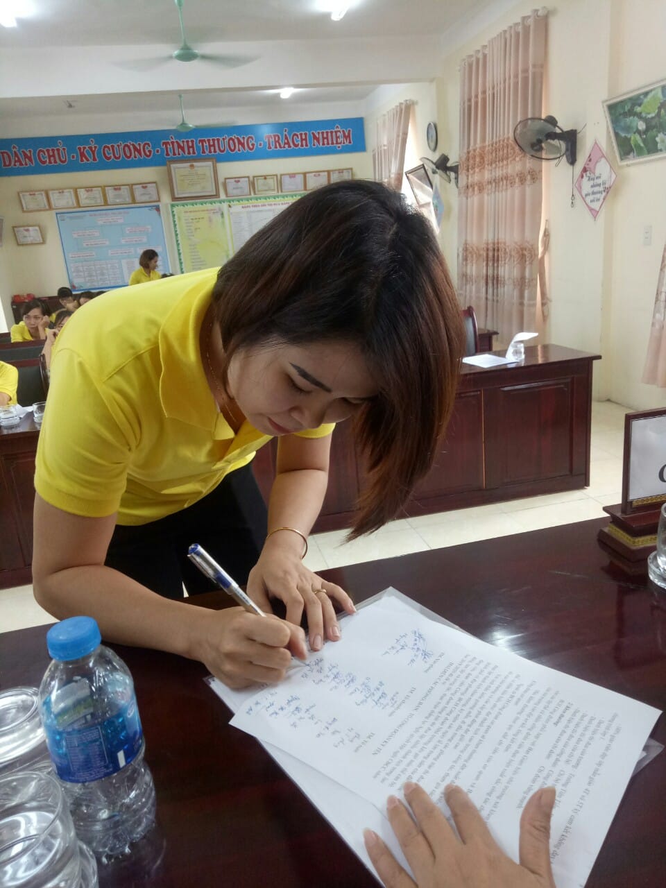 Để thể hiện rõ quyết tâm hưởng ứng các phong trào thi đua trong năm học 2019-2020,Đ/c Đào Thị Nhàn- BTCB-HT và đ/c NguyễnThị Hải Lý - CTCĐ cũng 2 đ/c đại diện Tổ chuyên môn và Tổ nuôi đã ký giao ước thi đua. 100% CBGVNV ký cam kết về pháp lệnh dân số, thực hiện kế hoạch nhiệm vụ năm học, Chấp hành Luật ATGT, Thực hiện qui tắc ứng xử nơi công sở.