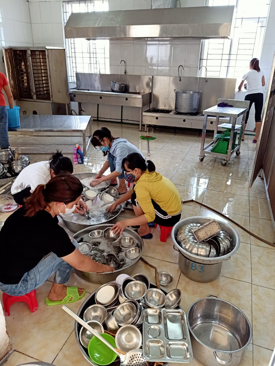 Các cô nhân viên nuôi dưỡng vệ sinh bát thì, đồ dùng nấu ăn
