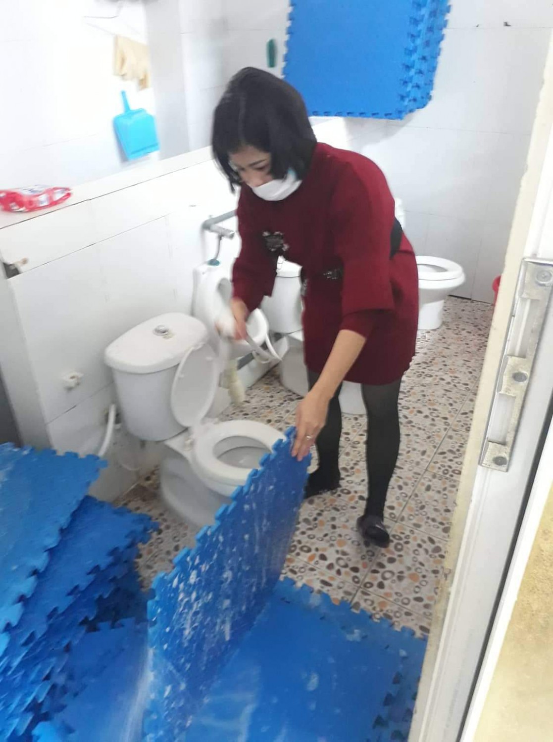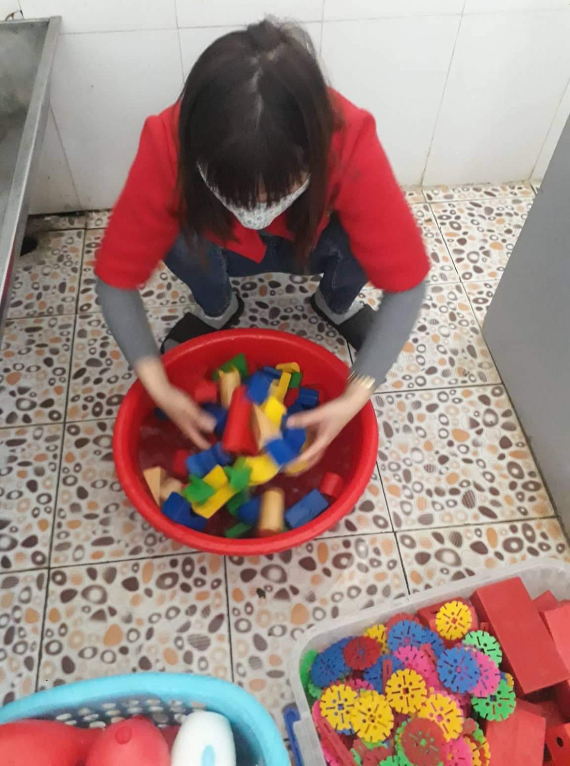 Giáo viên rửa đồ dùng đồ chơi trong lớp
